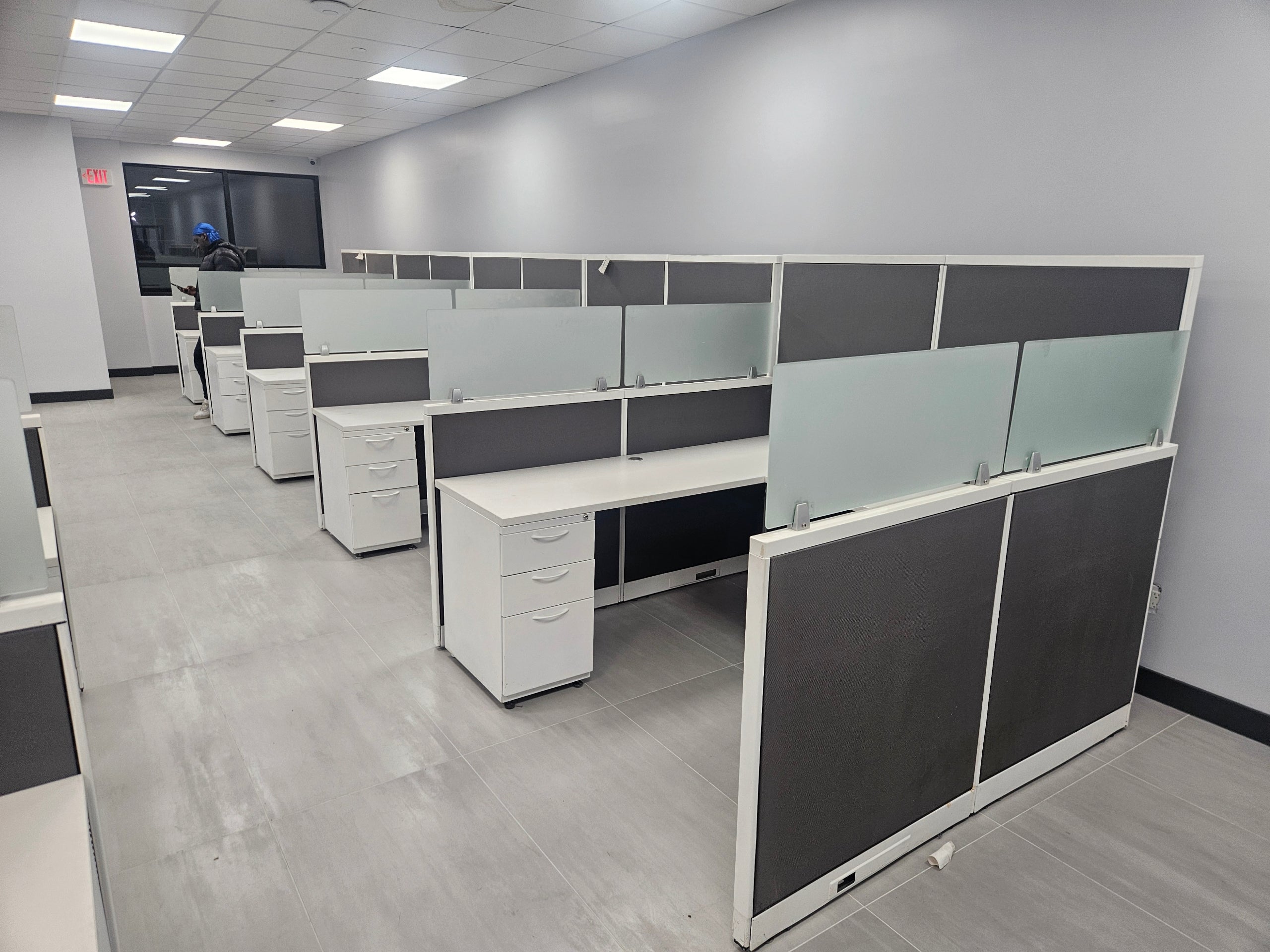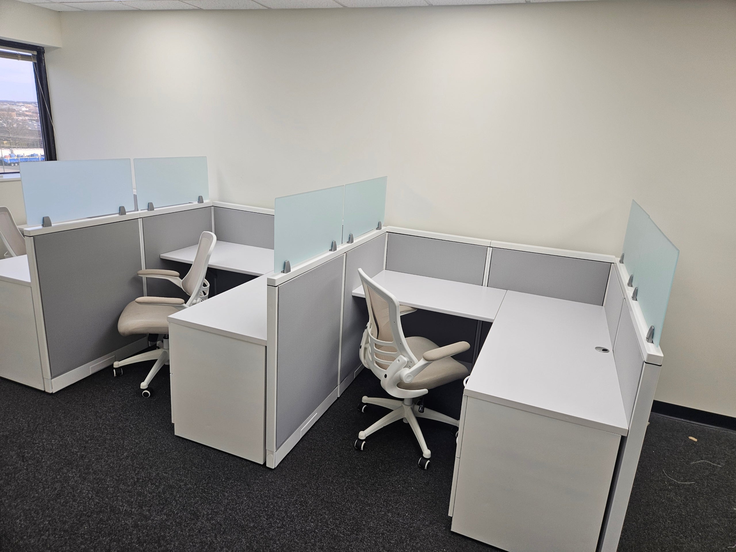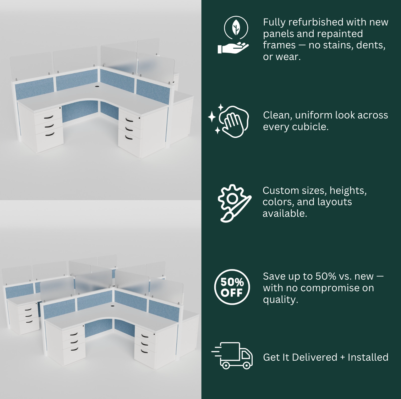 We give used cubicles a makeover! We swap out all the used panel boards with new one's and repaint the frames, so you get cubicles that look and feel brand new – goodbye stains and scratches!