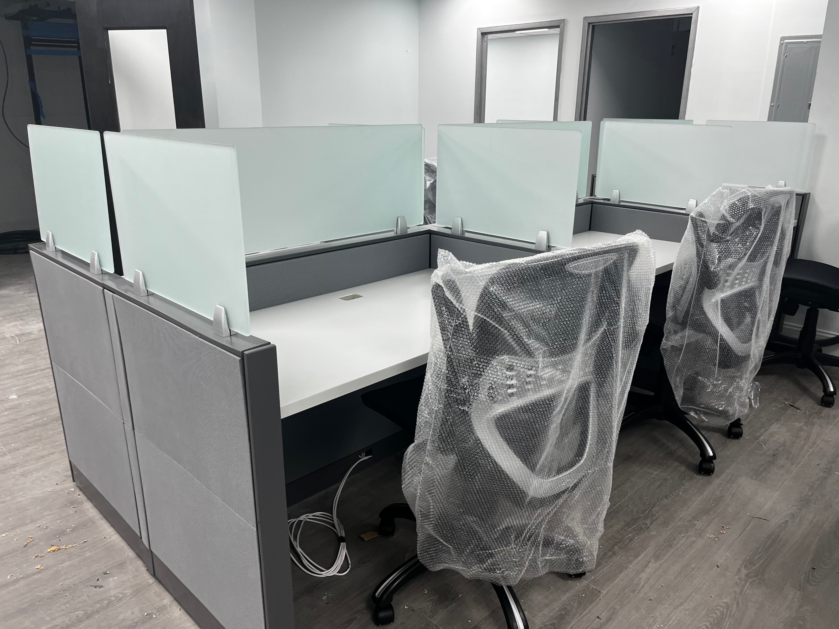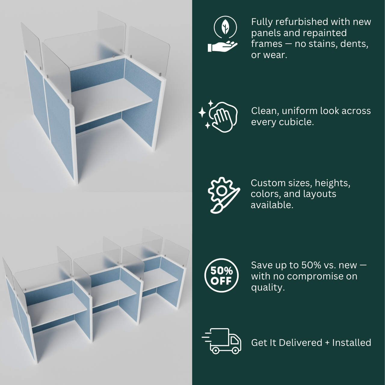 We give used cubicles a makeover! We swap out all the used panel boards with new one's and repaint the frames, so you get cubicles that look and feel brand new – goodbye stains and scratches!